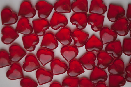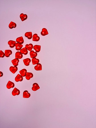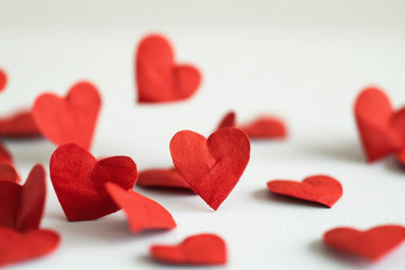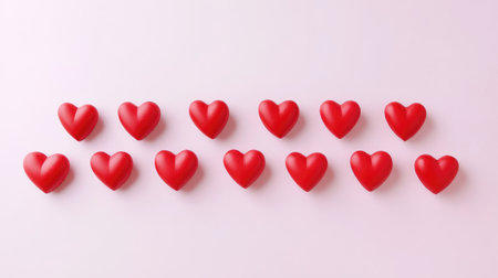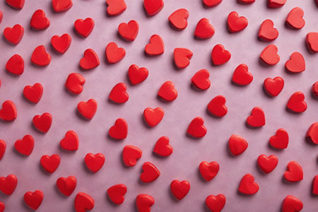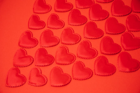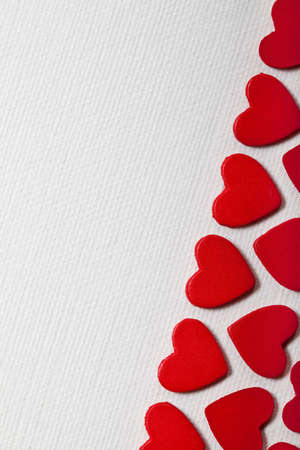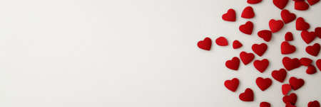 Small red hearts are arranged on a white surface, creating a romantic background perfect for valentines day, anniversaries, or declarations of love