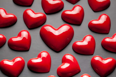 A collection of red hearts of various textures and shades, some shiny and others matte, arranged on a black background. The hearts represent love, romance, and the celebration of Valentine's Day.