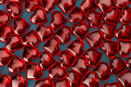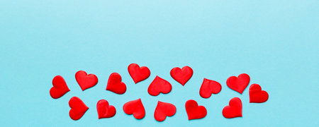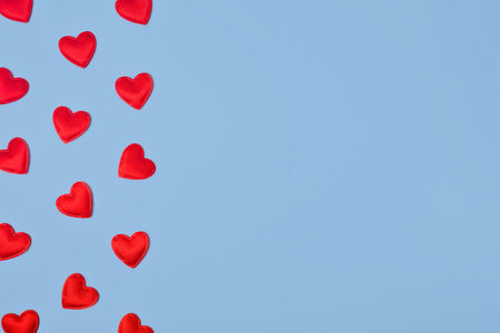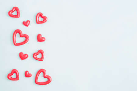 Flatlay of Small red hearts on a light blue background. Valentines Day banner or card with copy space. Love gift concept.