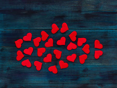 Valentines day background. Red hearts on rustic wooden background