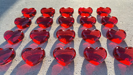 Red glass hearts shining in sunlight on concrete surface