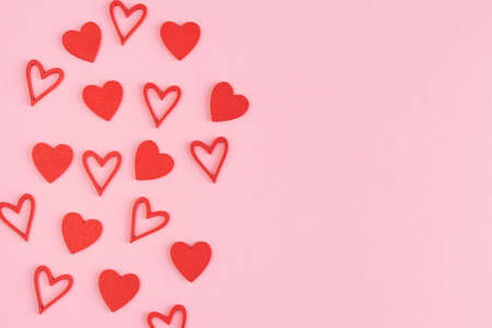 The concept of a festive background with red hearts. Flat layout, copying space
