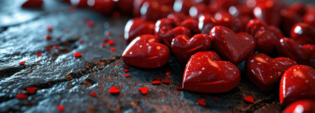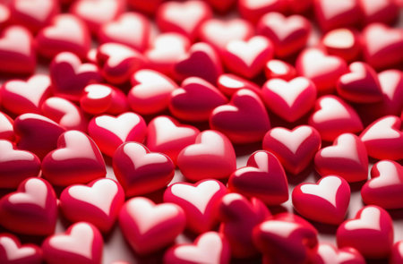 A bunch of red and white hearts are scattered on a table, AI