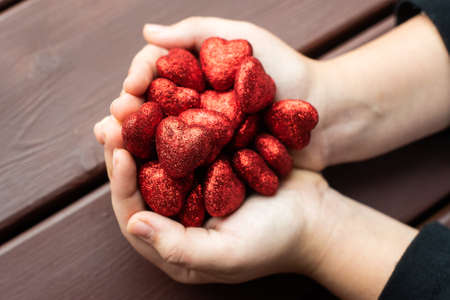 childrens hands are holding many red glittering hearts. Valentines Day. Love, February 14. The concept of love, trust, faith, help.