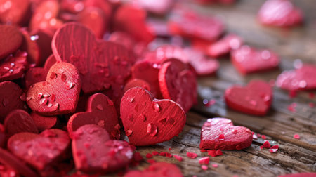 AI Generated. Red hearts and petals scattered on a wet wood surface background