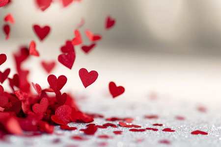 Bright confetti hearts create a romantic atmosphere against a dark background