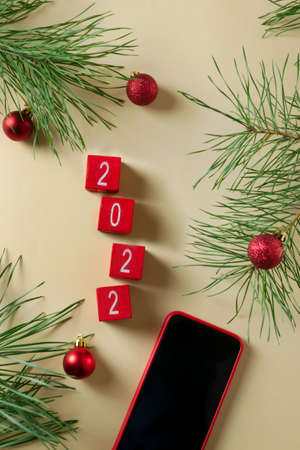 Happy New Year 2022 greeting card. Smartphone and several pine branches with red balls and gold stars. Celebration atmosphere. Top view. Green screen.