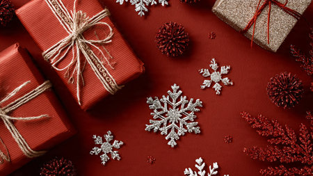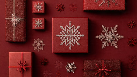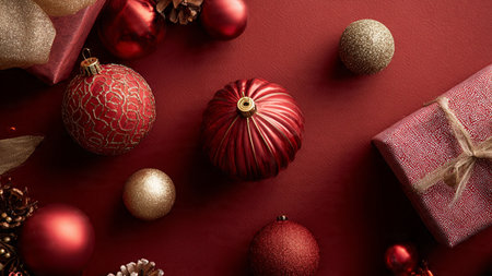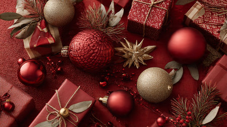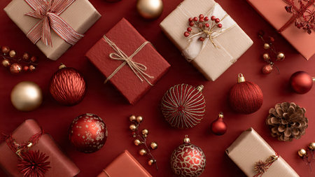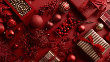 A vibrant and festive scene featuring colorful Christmas decorations, presents, and ornaments on a rich red background. Perfect for holiday themes.