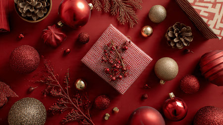 A vibrant arrangement of Christmas decorations including gifts, holly, pinecones, and red ornaments on a bold red background. Perfect for festive themes.