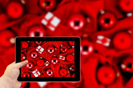 Tablet photography concept. Taking pictures on a tablet. Background of red Christmas tree balls, little gift boxes and gold decorations on red shiny silk fabric