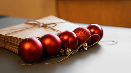Christmas composition. Craft envelopes and Christmas red balls. Stack of letters tied with twine on blurred background
