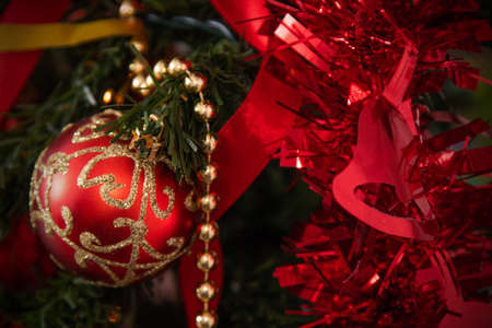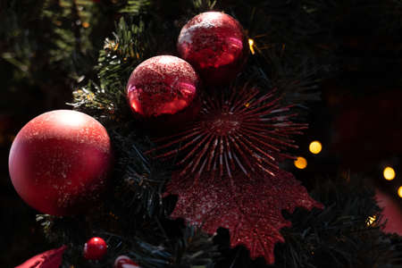 Decorated Christmas tree close-up. Red balls and a garland with illumination with lanterns. New Year's baubles macro photo with bokeh. Winter holiday light decoration