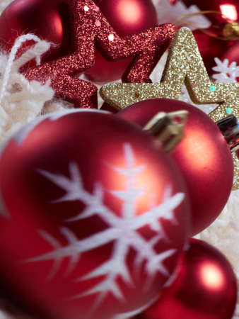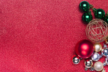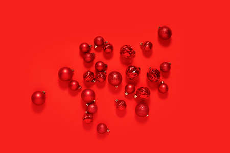 Group of decorative red christmas ornaments background, forming festive seasonal background. Perfect for greeting cards or holiday promotions.