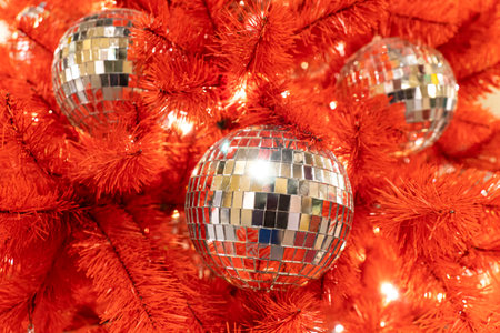 Christmas disco ball with a red bow on the Christmas tree. new Year's background. Decorated Christmas tree.