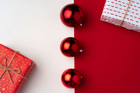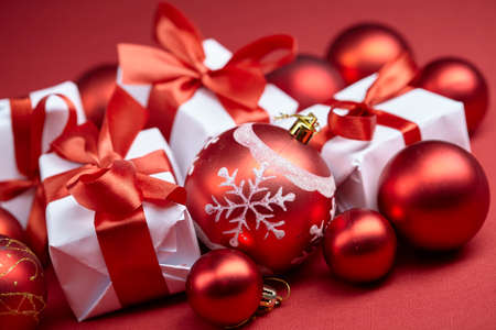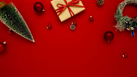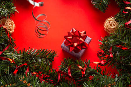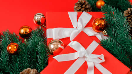 Gift box and Christmas decoration on red background, copy space for the text. Merry Christmas and Happy New year