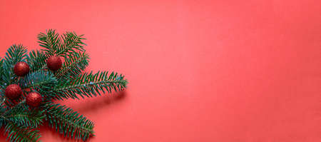 Christmas decoration. Fir tree twig fresh decorated against red color background, banner, copy space