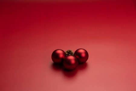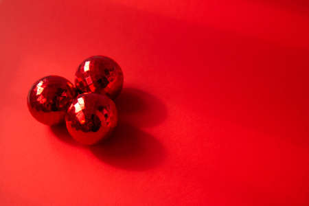 Three red Christmas balls on red background with contrasting shadows. Merry Christmas card. Concept of celebrating new year. Copy space