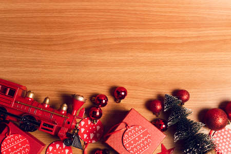Christmas collection, gifts box, tree and decorative ornaments, on rustic wood