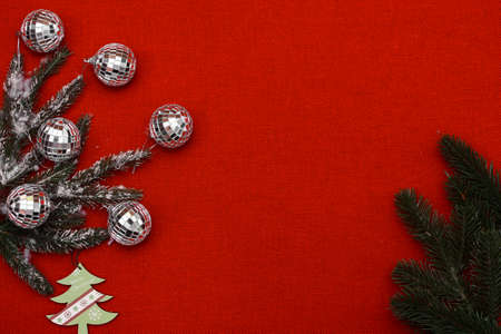 Christmas layout on a red fabric background with Christmas toys and spruce branches