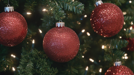 Shiny red ornaments on a Christmas tree with a background of soft twinkling lights, creating a traditional holiday scene.