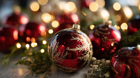 Stacked red and gold Christmas baubles with glitter details and soft bokeh lights. Warm festive still life suitable for holiday advertising and seasonal decor.