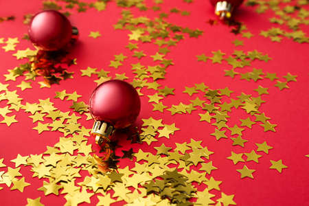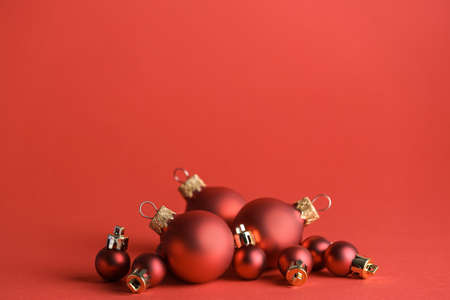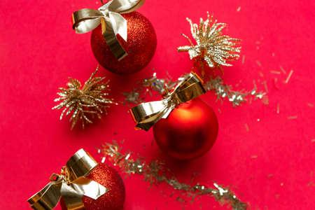 Red Christmas baubles with golden bows on red background. Merry Christmas and Happy New Year