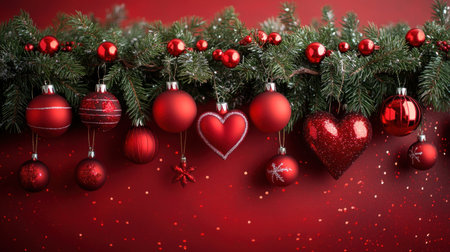 Cheerful red ornaments and hearts hang from evergreen branches, creating a vibrant seasonal display.