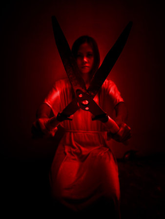 Horror scene of woman with grass shears,Serial killer or violence concept background