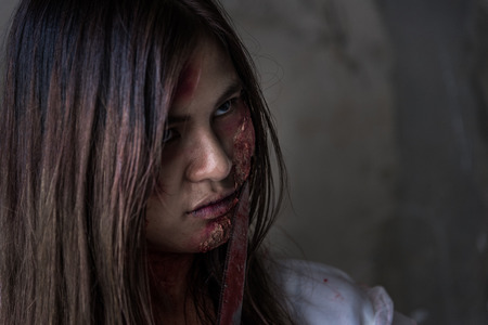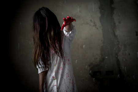 horror scence of women hold knife by hands with blood. Ghost women wear white dress stain blood at abandoned house