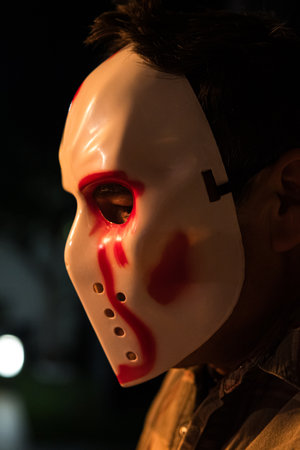 Halloween in Covid-19 Situation Concept. Person Wearing a Surgical Mask as Make-up and Paint with Blood. Scary Horror Face. Dark Tone. Closeup shot
