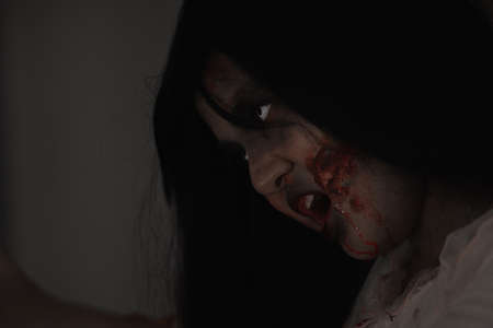 Girl zombie in blood. Closeup face and eyes of Asian Woman ghost with blood. Horror creepy scary fear in a dark house. Hair covering the face, Halloween festival concept