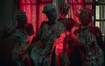 Dnipro, Ukraine - June 27, 2020: Cosplayers in the image of Dark Nurses from the horror movie Silent Hill stand in dark room.