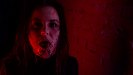 young woman is possessed by devil, black eyes and blood from mouth, portrait in room with red light