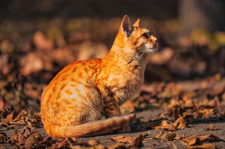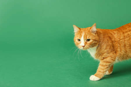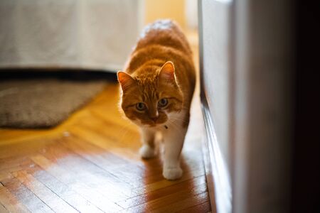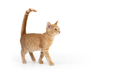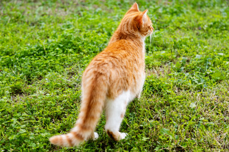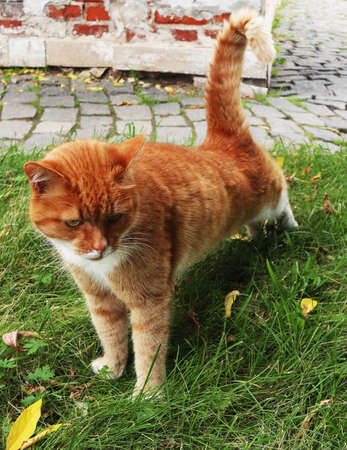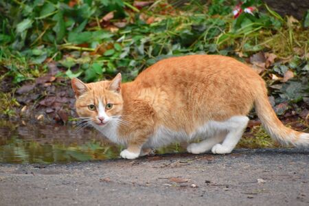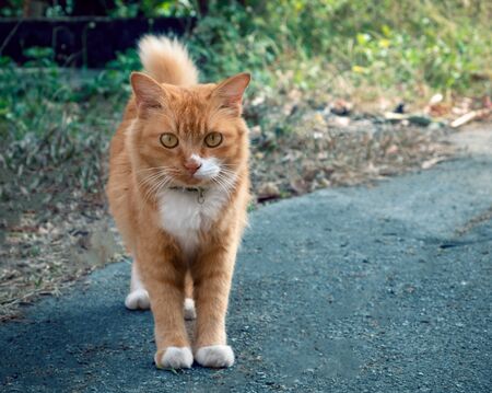 Ginger cat Close up view of lovely Ginger cat kitten walks on the ground