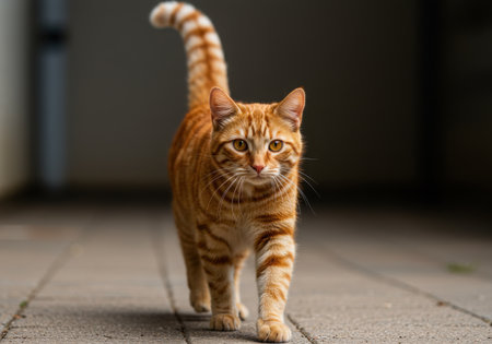 A ginger tabby cat is walking directly towards the camera. The cat's tail is raised, and its eyes are focused. The background is blurred, drawing attention to the cat's movement and vibrant orange fur.