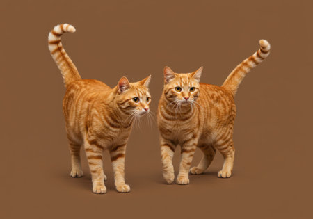 Two orange tabby cats are standing side by side on a brown background. They are looking in different directions. Both cats have their tails up and are alert. They appear healthy and well-groomed.