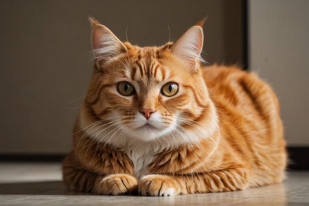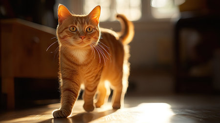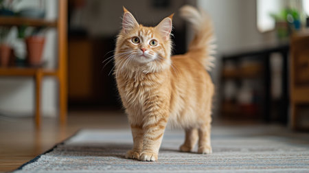Orange cat standing on the floor, fur shining in the light, in a relaxed and calm pose.