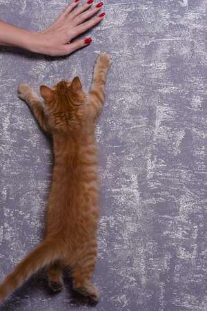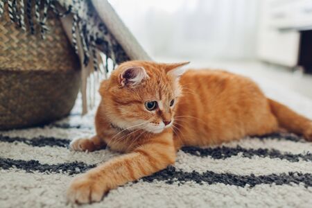 Ginger cat lying on floor carpet at home. Pet playing and feeling comfortable having fun