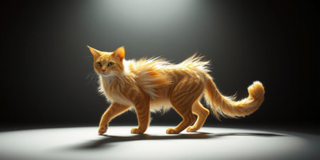 A magnificent red Maine Coon cat stands proudly in profile against a neutral studio background. Its luxurious, long fur and bushy tail are beautifully illuminated, showcasing its majestic and elegant stature. This poised feline exudes a sense of calm confidence and purebred beauty.
