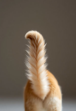 A stunning ginger Maine Coon cat sits in elegant profile against a clean studio background. Its magnificent, bushy tail, a luxurious plume of red fur, is displayed proudly, showcasing the breeds majestic and gentle nature. This portrait captures the quiet confidence and beauty of a beloved purebred pet.