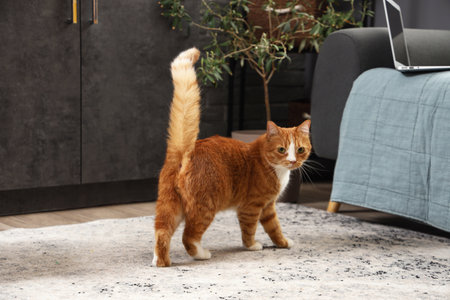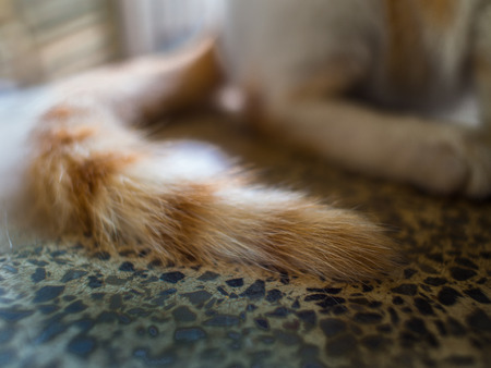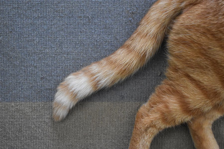 Ginger cat tail. Tabby cat lying on old scratched old rug or carpet.