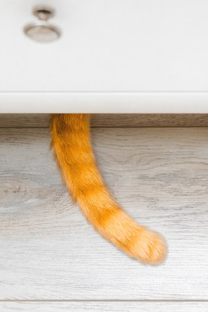 a red cat's tail sticks out from under the cabinet. vertical photo
