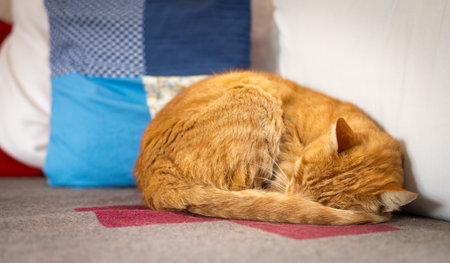 Cute ginger cat lying on bed. Fluffy pet is dozing. Cozy home background.