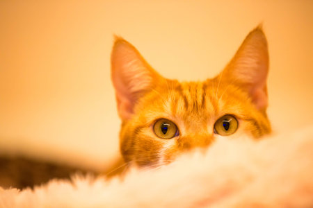 Cute ginger cat on bright orange background. Portrait of proud fluffy pet. Furry domestic cat.
