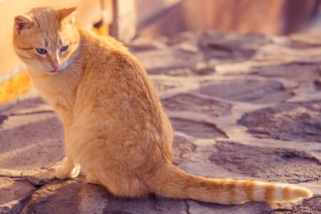 Lovely ginger cat sitting on a sunny stone floor outdoor