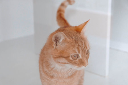 Ginger cute cat sitting and looking curiously on white background. Space for your text. Adorable home pet stock photography