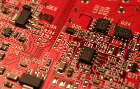 Electronic Printed Circuit Board in red with Electronic components viewed from above