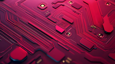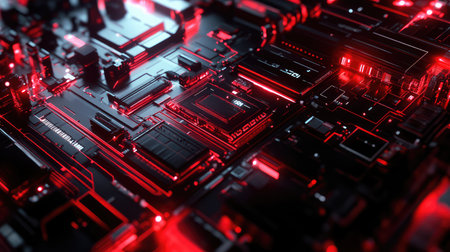 Intricate, glowing red circuit board pathways and components. This abstract macro shot symbolizes advanced technology, digital networks, data flow, and the future of artificial intelligence and innovation.