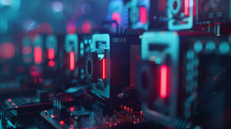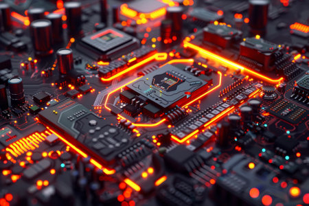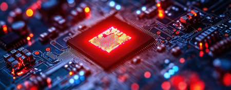 Microchip glows with neon lights in a complex circuit board. Detailed technology setting. Close-up of a glowing red microchip on a circuit board surrounded by intricate components and lights. Advanced technology and electronic engineering. Tech concept and IT