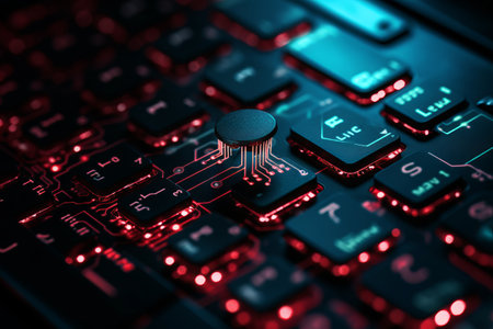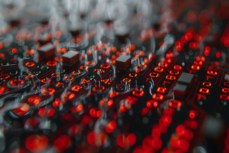 This image showcases a close-up view of glowing microchips amidst a dark circuit board, featuring red lights and intricate digital patterns, emphasizing technology.